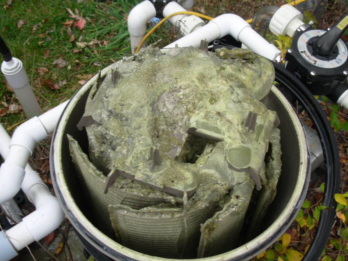 All swimming pool equipment requires proper maintenance. In this instance, the DE filter was not being properly back-washed or cleaned on a regular basis, and too much new DE was being added. This caused excess DE to accumulate and clog the filter. Aqua-Matic Pools dismantled the filter, thoroughly cleaned the filter and grids, reassembled the equipment, and provided the homeowner with a refresher on filter care and maintenance. With a properly functioning filter, and a little attention to water chemistry, the pool owner’s family was back to swimming in a crystal clear pool in no time!